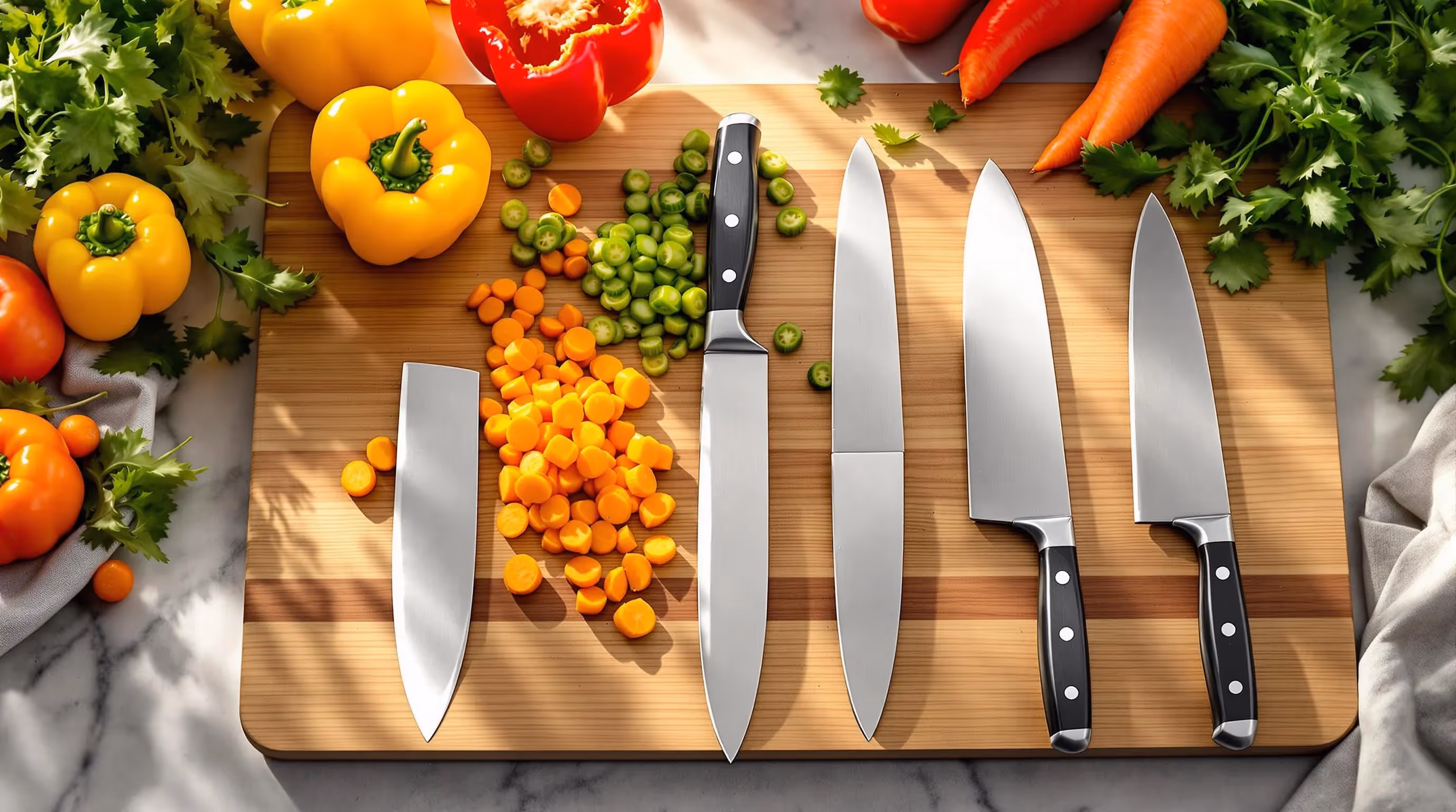 - Chefmesser: Vielseitig einsetzbar für harte Gemüsesorten wie Karotten oder Kohl sowie Kräuter.